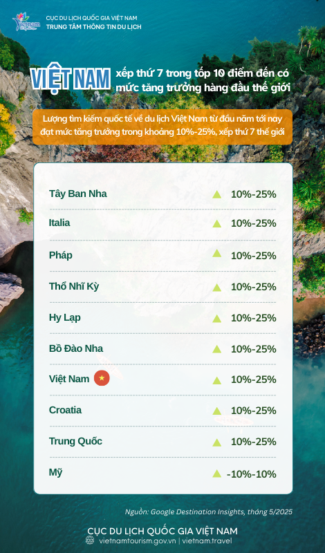 (TITC) - Lượng tìm kiếm quốc tế về du lịch Việt Nam từ đầu năm tới nay đạt mức tăng trưởng trong khoảng 10%-25%, xếp thứ 7 thế giới.