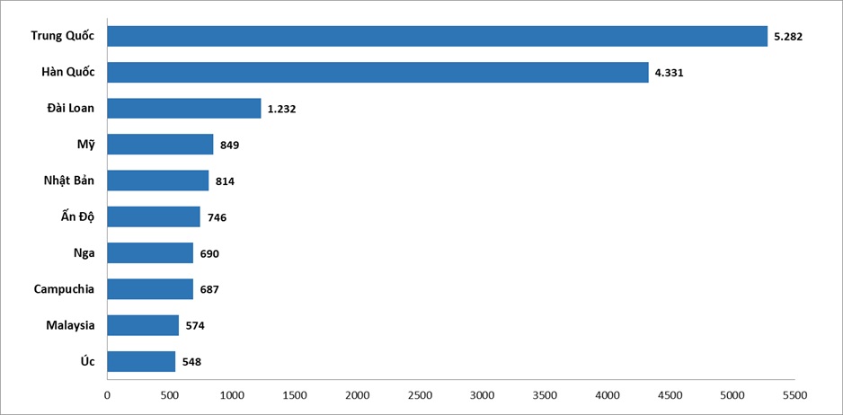 Trong 10 thị trường gửi khách hàng đầu của Việt Nam còn có Đài Loan (1,2 triệu lượt), Mỹ (849 nghìn lượt), Nhật Bản (814 nghìn lượt), Ấn Độ (746 nghìn lượt), Nga (690 nghìn lượt), Campuchia (687 nghìn lượt), Malaysia (574 nghìn lượt) và Úc (548 nghìn lượt).