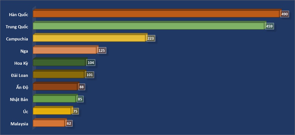 Nhật Bản tăng mạnh 41% so tháng trước và 16,9% so với cùng kỳ, cho thấy sự phục hồi tốt của phân khúc khách có mức chi tiêu cao. Thị trường Trung Quốc dù giảm so với cùng kỳ nhưng lượng khách vẫn rất lớn, đạt gần 460 nghìn lượt, xếp thứ hai sau Hàn Quốc.
