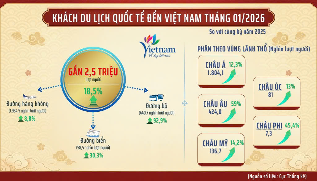 Kỷ lục 2,5 triệu lượt khách quốc tế của tháng 1/2026 không chỉ là một con số ấn tượng, mà có thể được nhìn nhận như một điểm khởi đầu cho chu kỳ tăng trưởng mới của du lịch Việt Nam trong giai đoạn phát triển tiếp theo. Du lịch Việt Nam đang chuyển từ trạng thái phục hồi sang nâng cao chất lượng tăng trưởng, gia tăng năng lực cạnh tranh. Các yếu tố như chính sách thị thực ngày càng thông thoáng, mở rộng kết nối hàng không, đổi mới sản phẩm và đẩy mạnh xúc tiến quảng bá tiếp tục đóng vai trò quan trọng trong việc thu hút khách quốc tế.