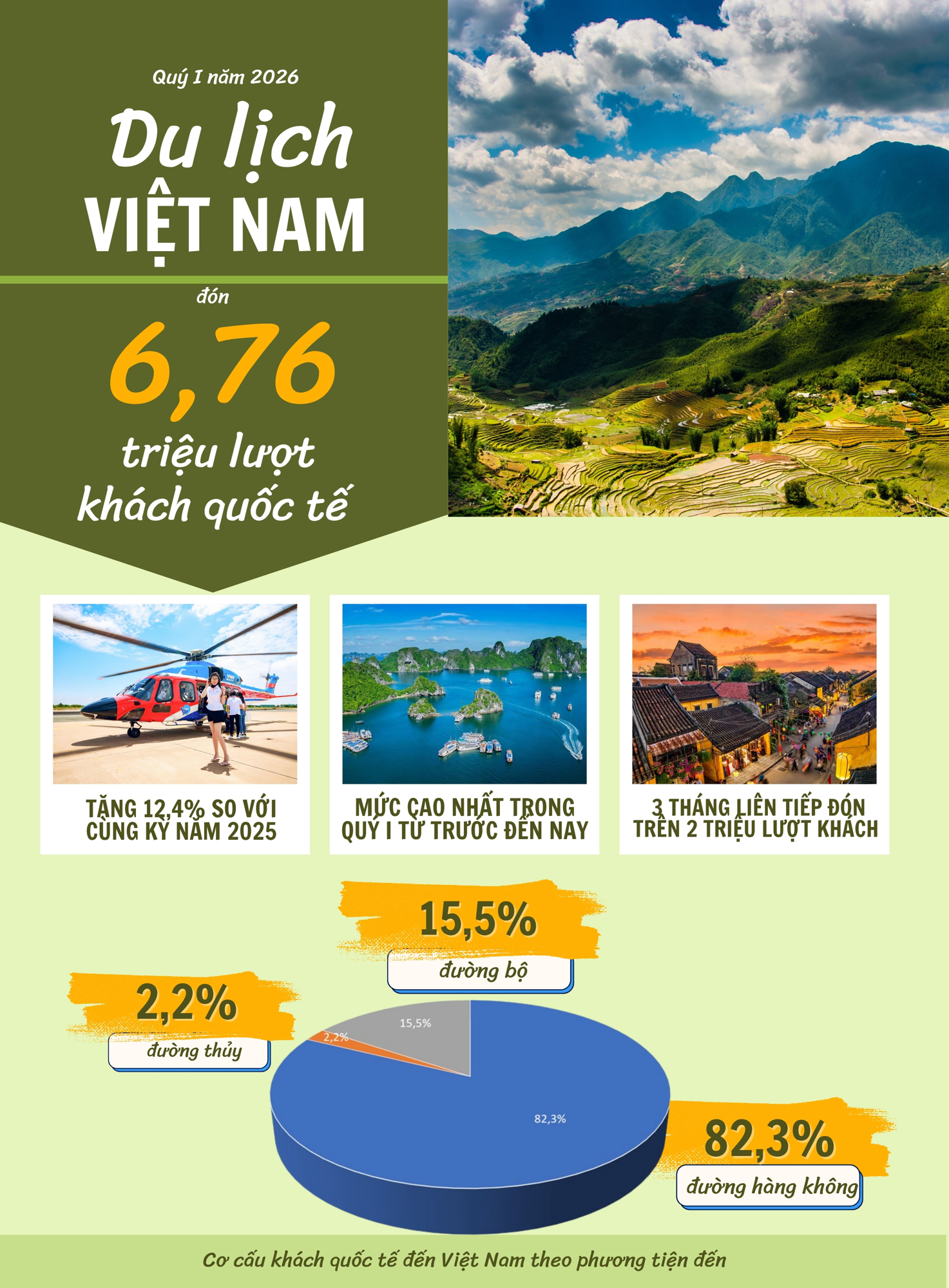 Tháng 3/2026, Việt Nam đón gần 2,1 triệu lượt khách quốc tế, nâng tổng số khách trong Quý I lên 6,76 triệu lượt, tăng 12,4% so với cùng kỳ năm 2025. Đây là mức cao nhất trong Quý I từ trước đến nay, đồng thời đánh dấu lần đầu tiên 3 tháng liên tiếp Việt Nam đón trên 2 triệu lượt khách quốc tế mỗi tháng.