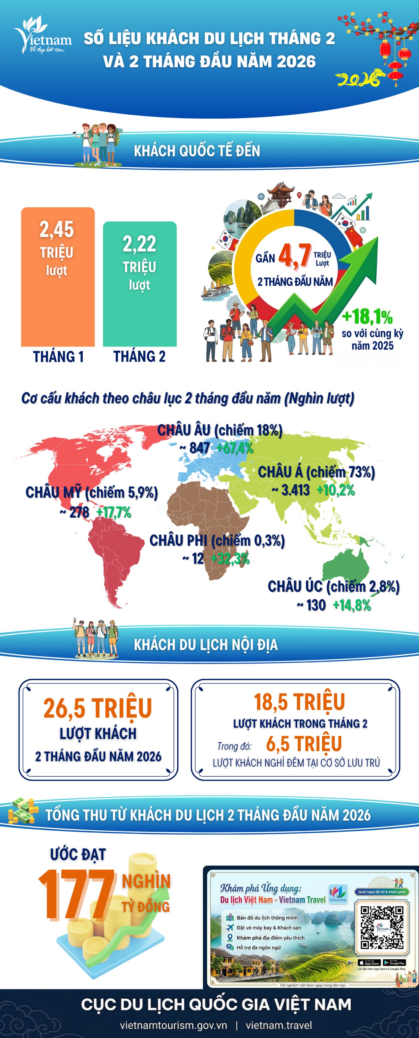 (TITC) - Dưới đây là Infographic về tình hình khách du lịch tháng 2 và 2 tháng đầu năm 2026, trong đó có số liệu về lượng khách quốc tế đến, khách du lịch nội địa, cơ cấu thị trường, tổng thu từ khách du lịch.