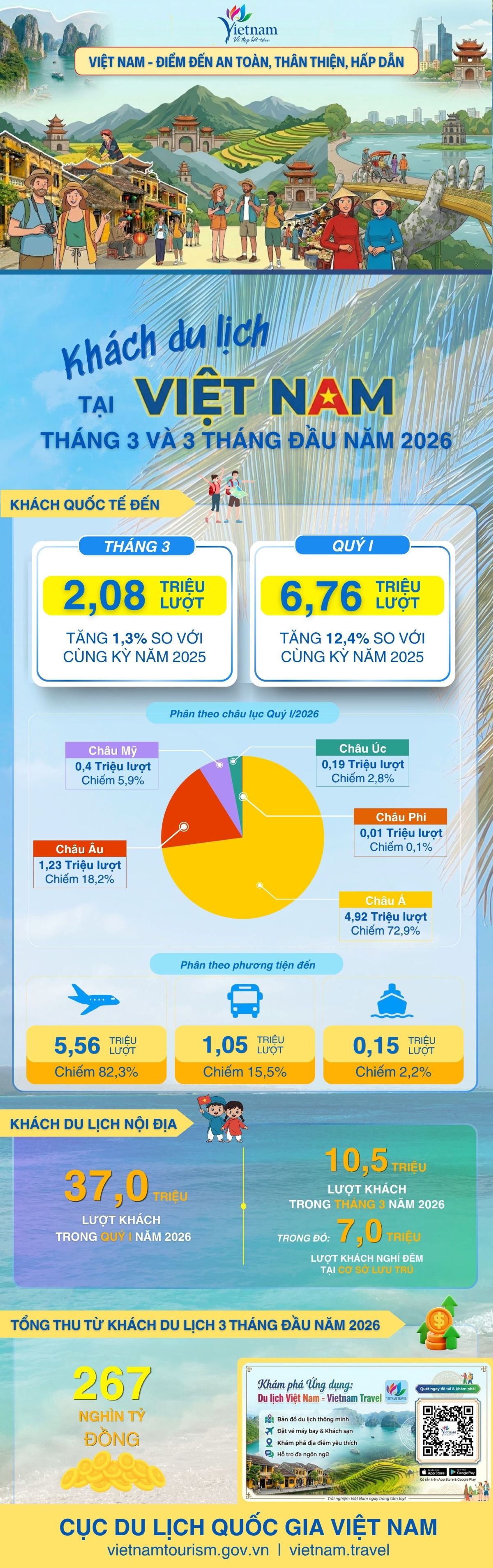 [Infographic] Tình hình khách du lịch tháng 3 và 3 tháng đầu năm 2026